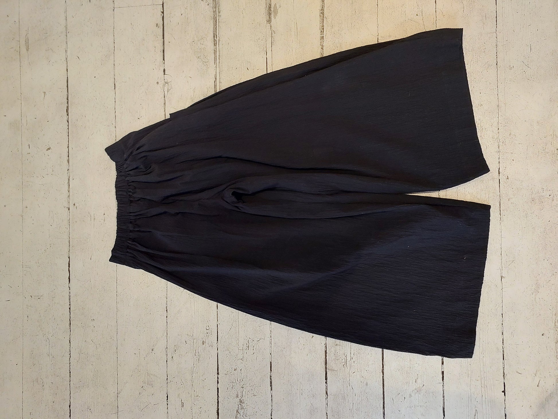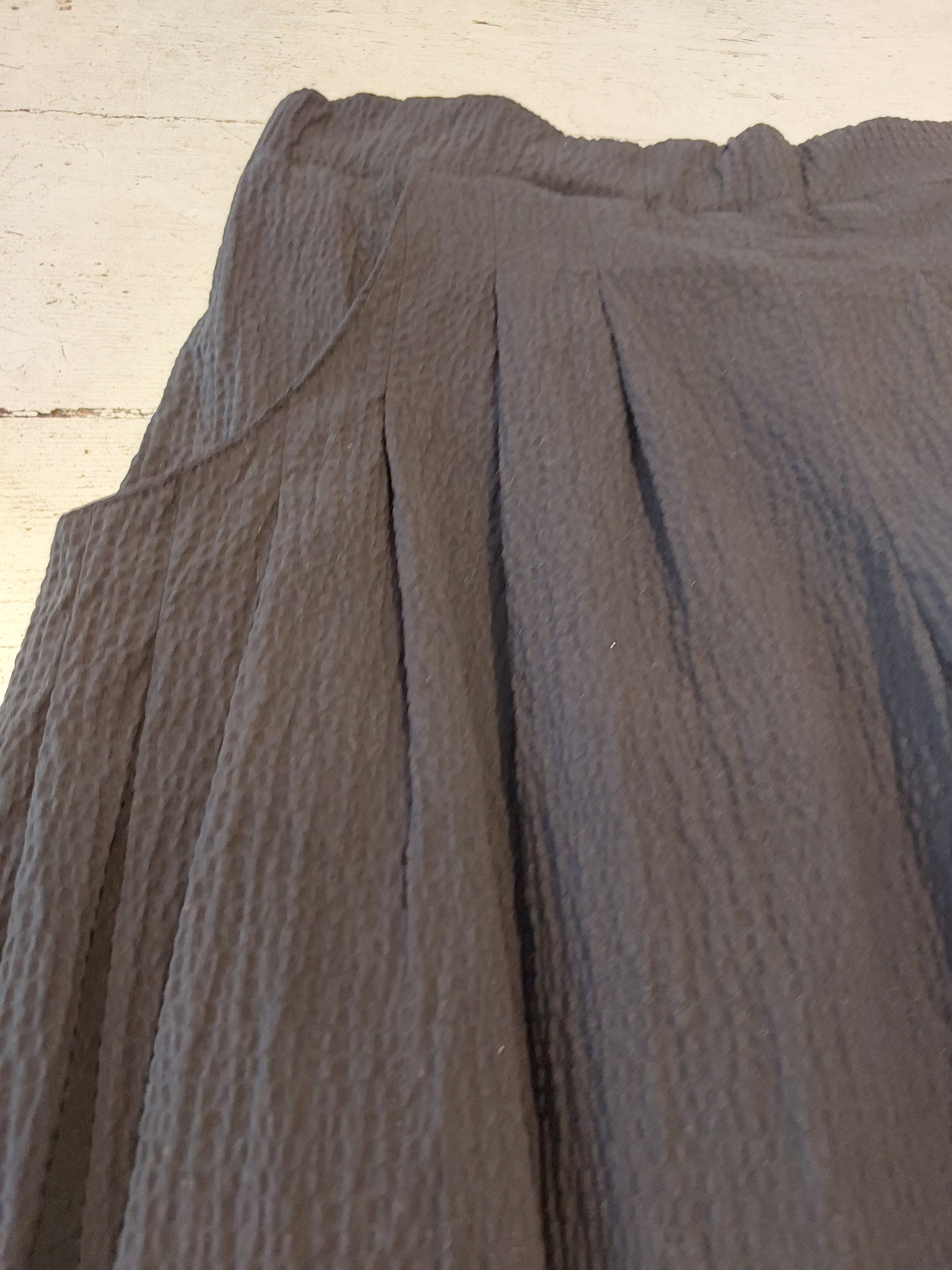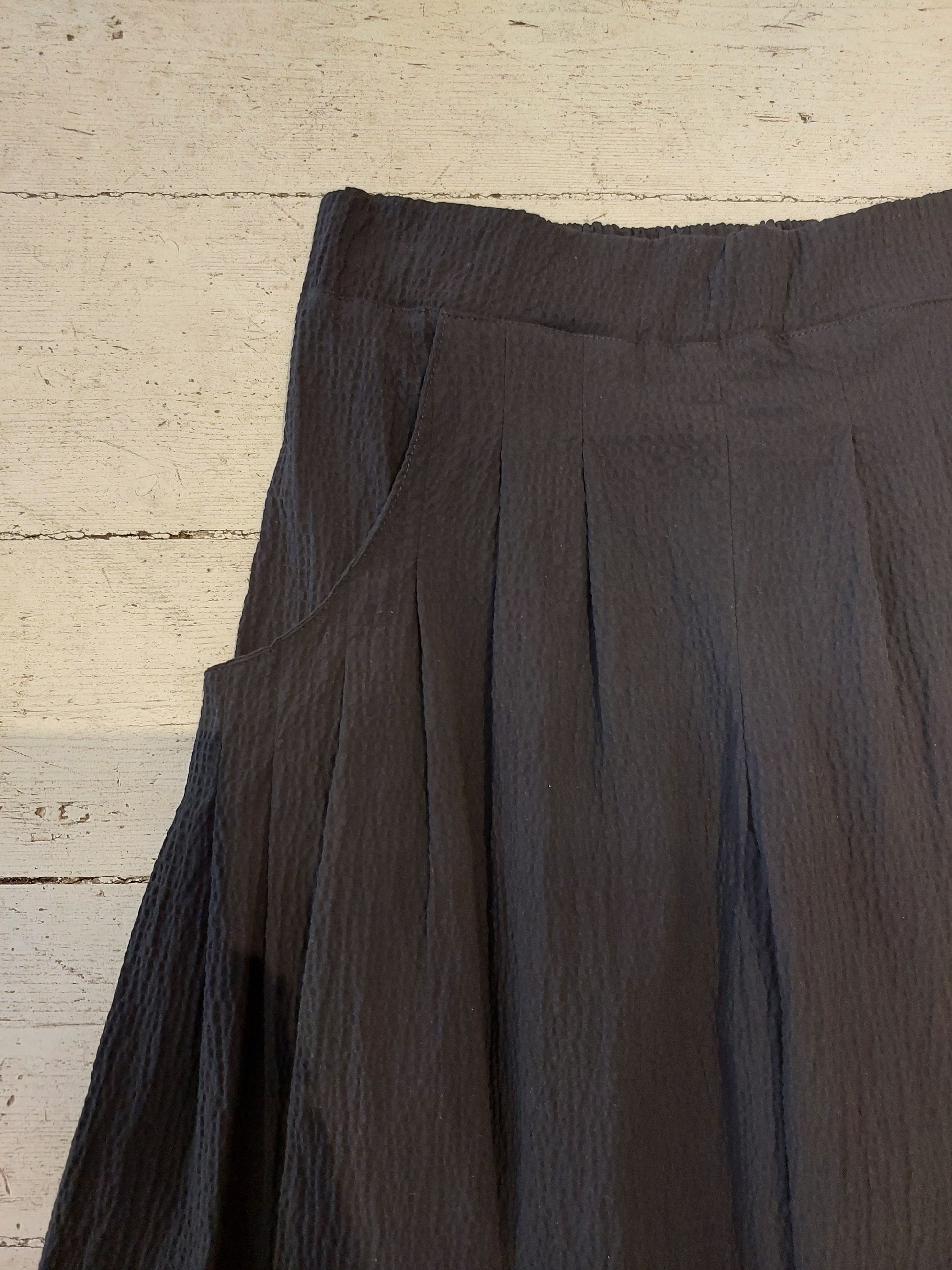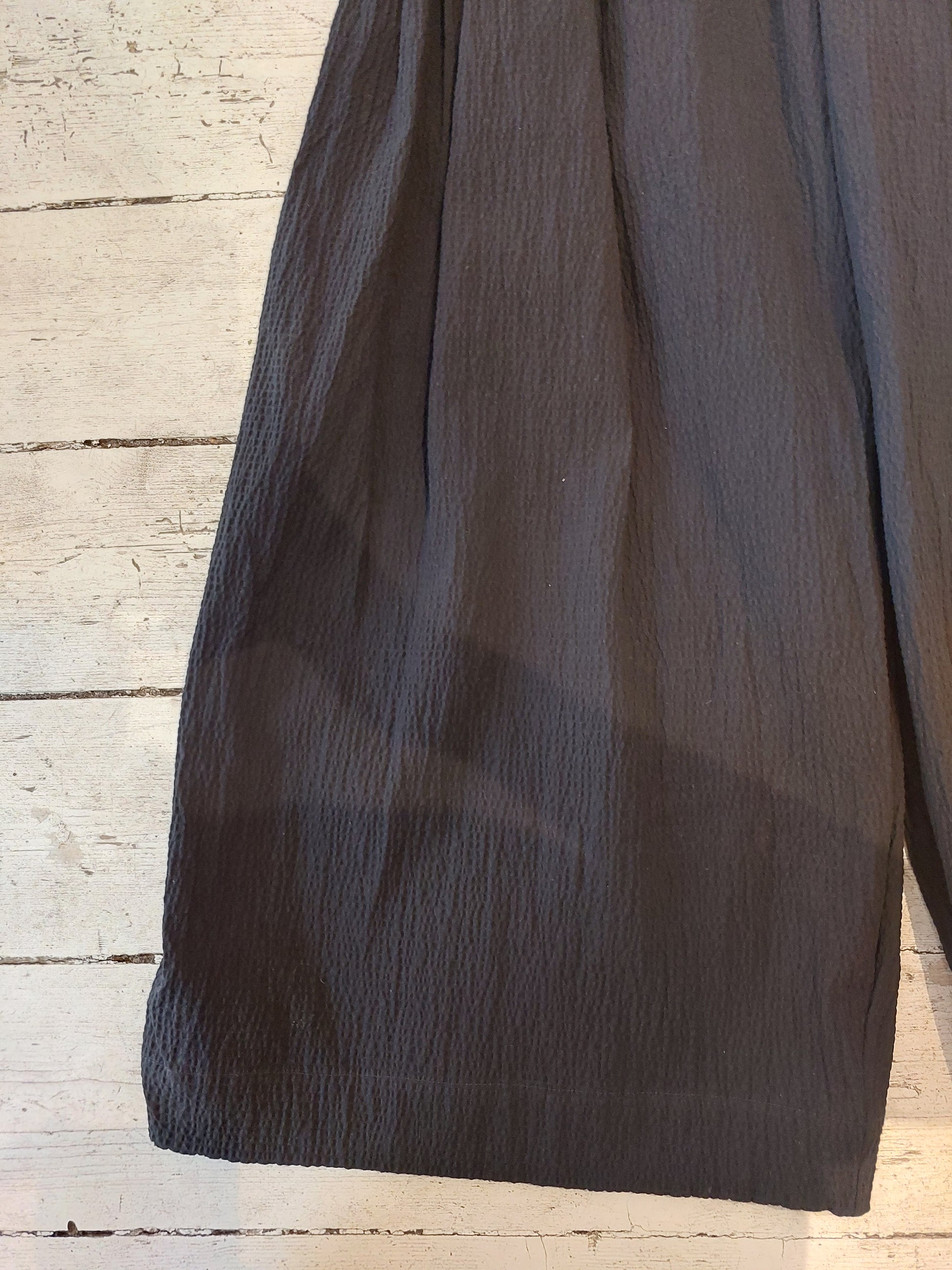 Made from lightweight organic cotton with a crinkle texture. Comfortable elasticated waist at the back for easy wearing. Pleated design with pleats following deep pocket openings. Balloon style leg. Made in our Glasgow Studio.