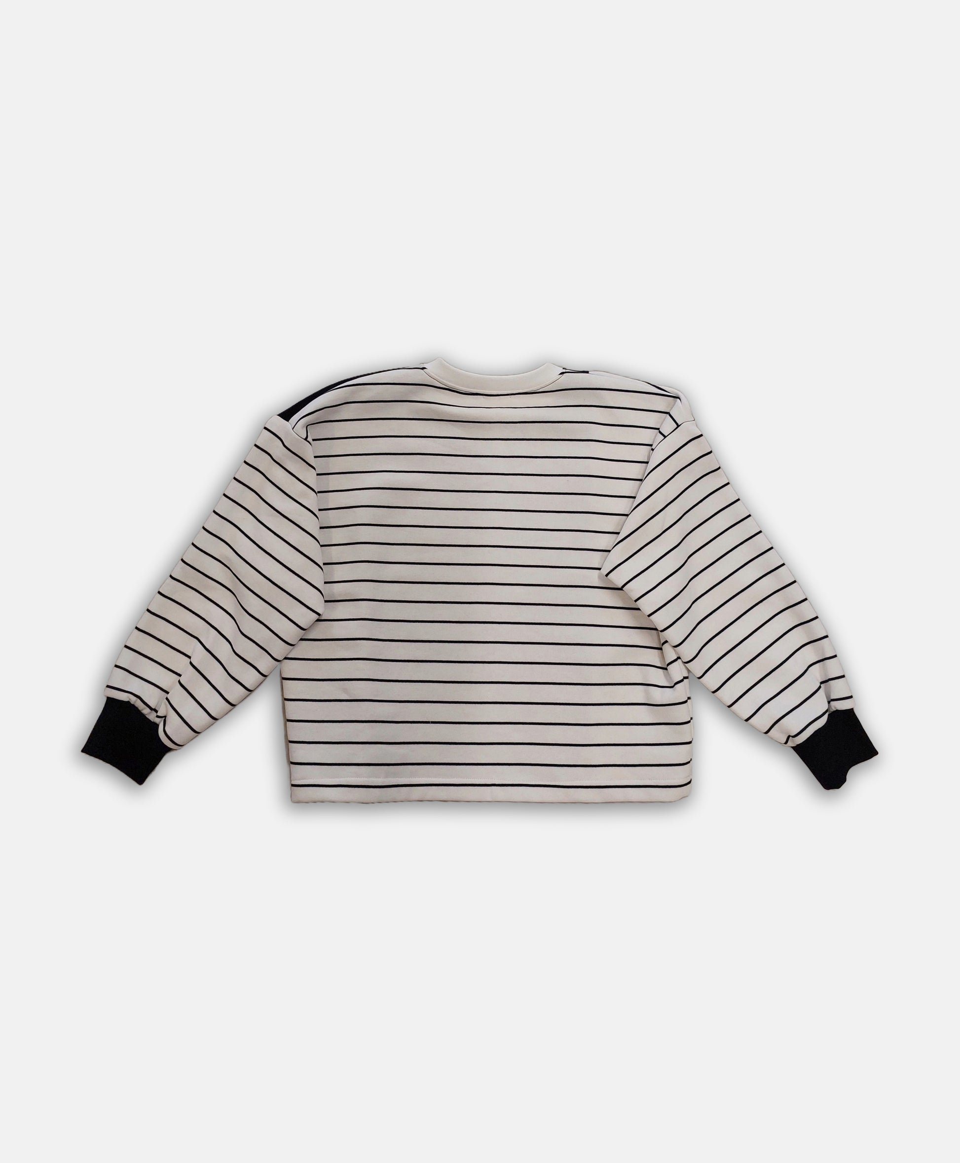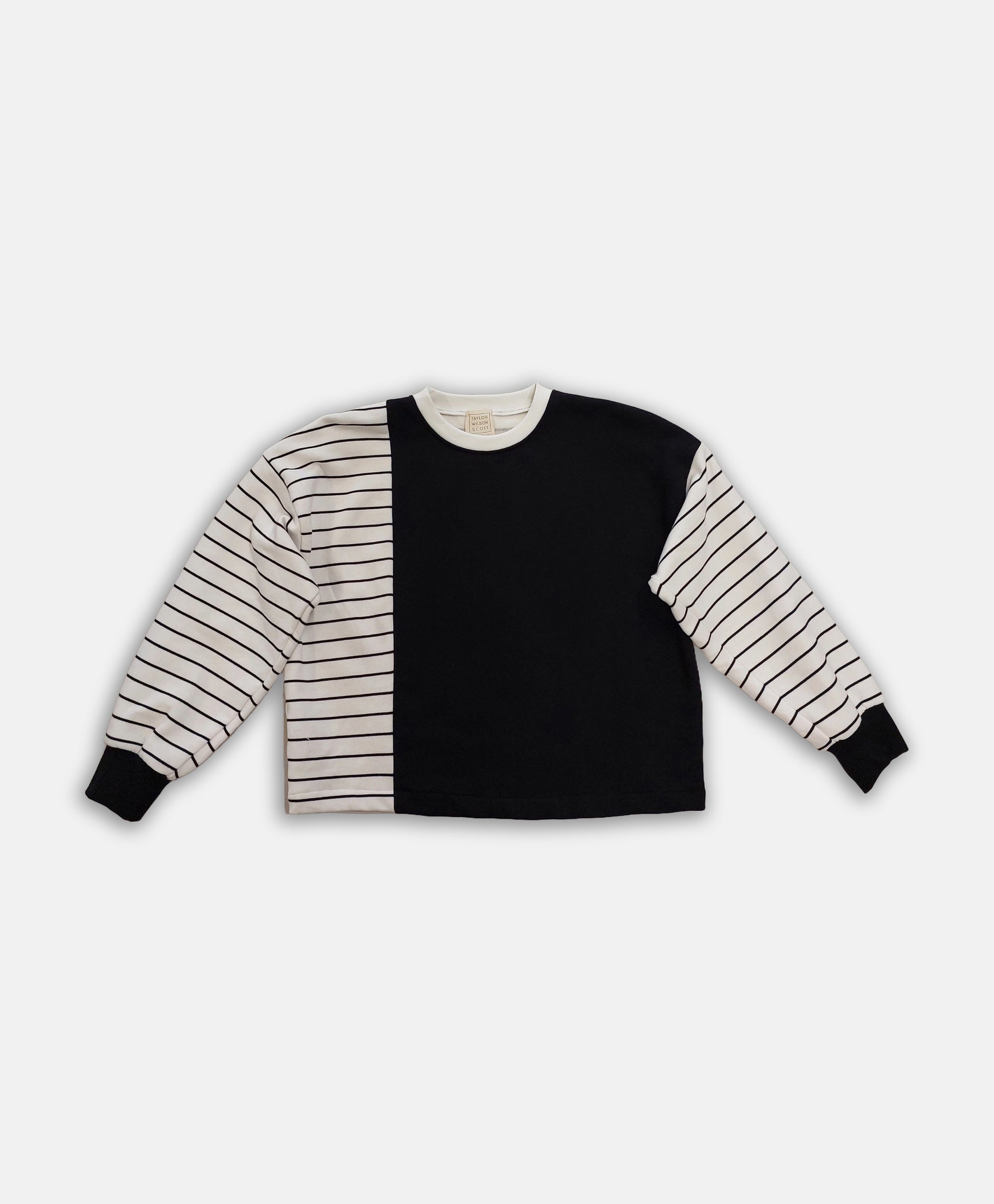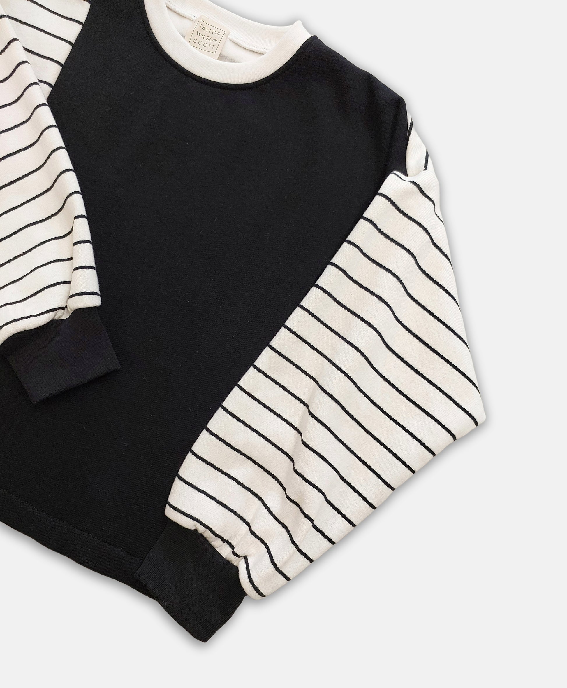 Mixed panel jumper made from organic cotton fleece. Brushed back, soft inside. Boxy, oversized fit with dropped shoulders and cuffed sleeves. Black fleece mixed with black and white straps. White contrasting neckline.