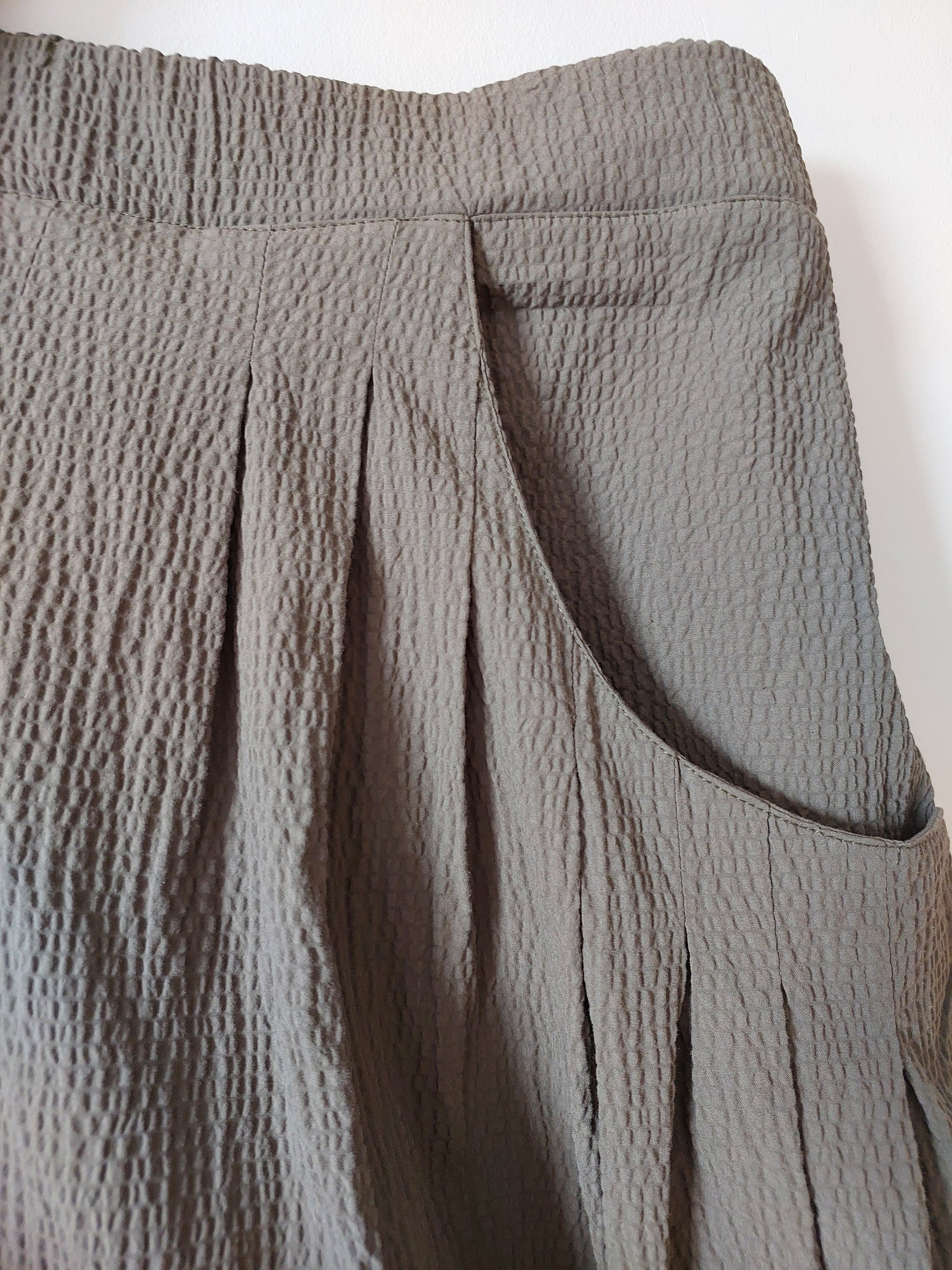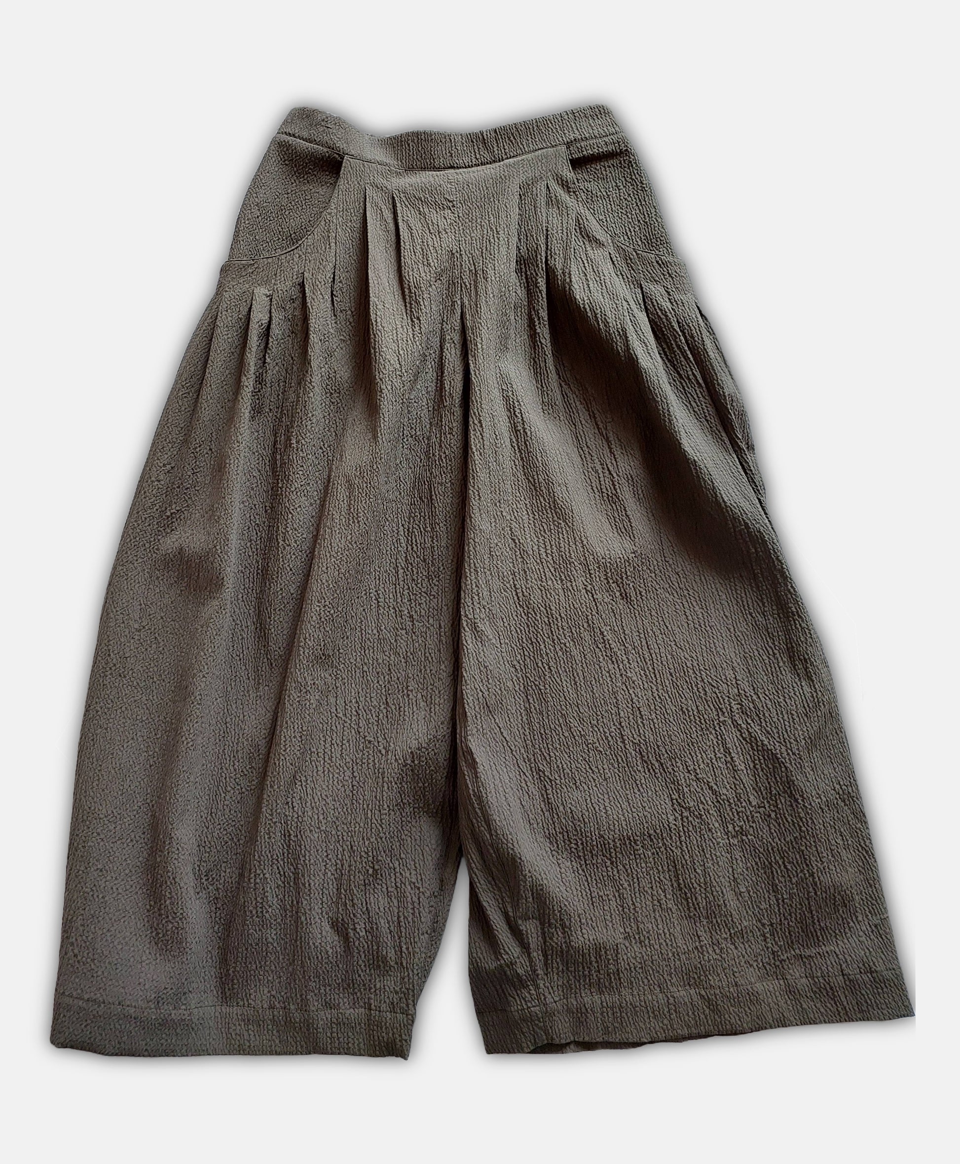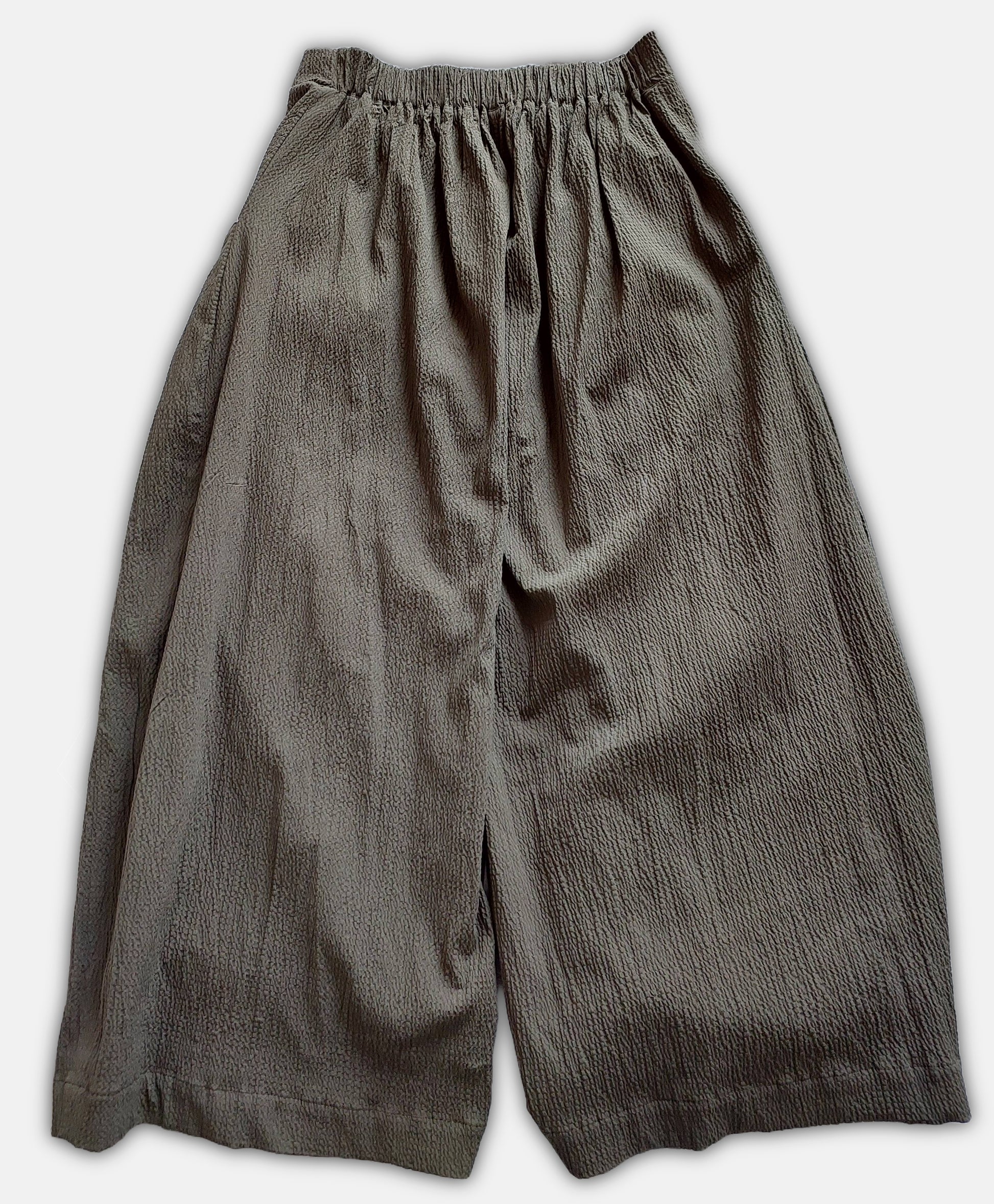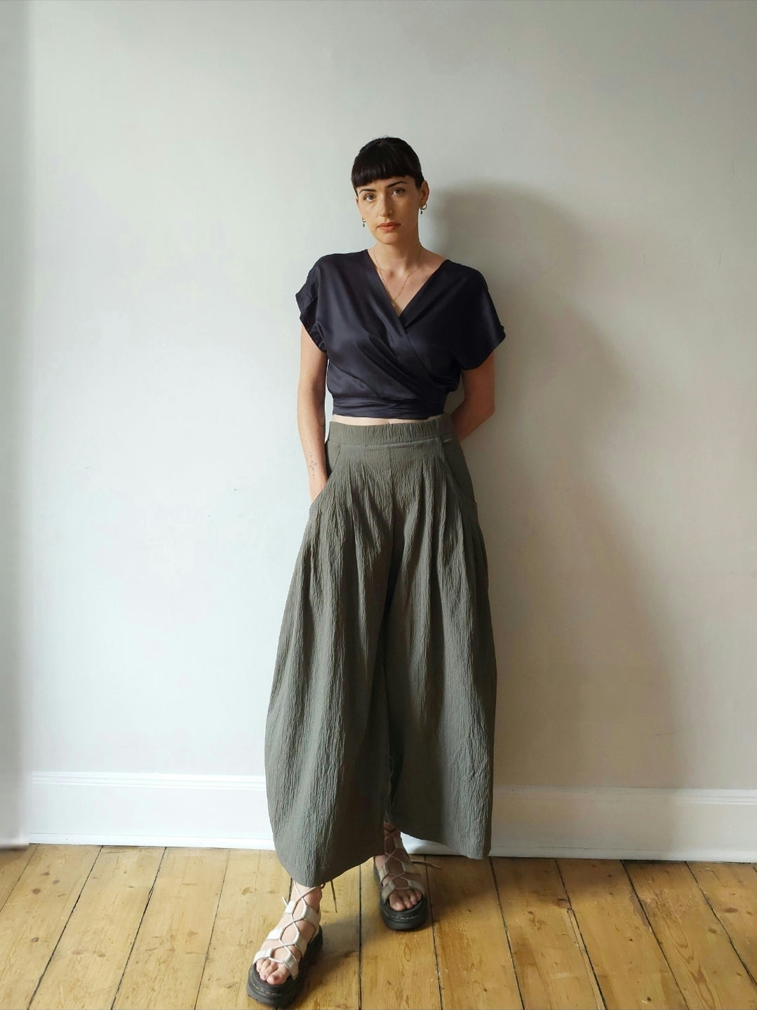Made from lightweight organic cotton with a crinkle texture. Comfortable elasticated waist at the back for easy wearing. Pleated design with pleats following deep pocket openings. Balloon style leg. Made in our Glasgow Studio.