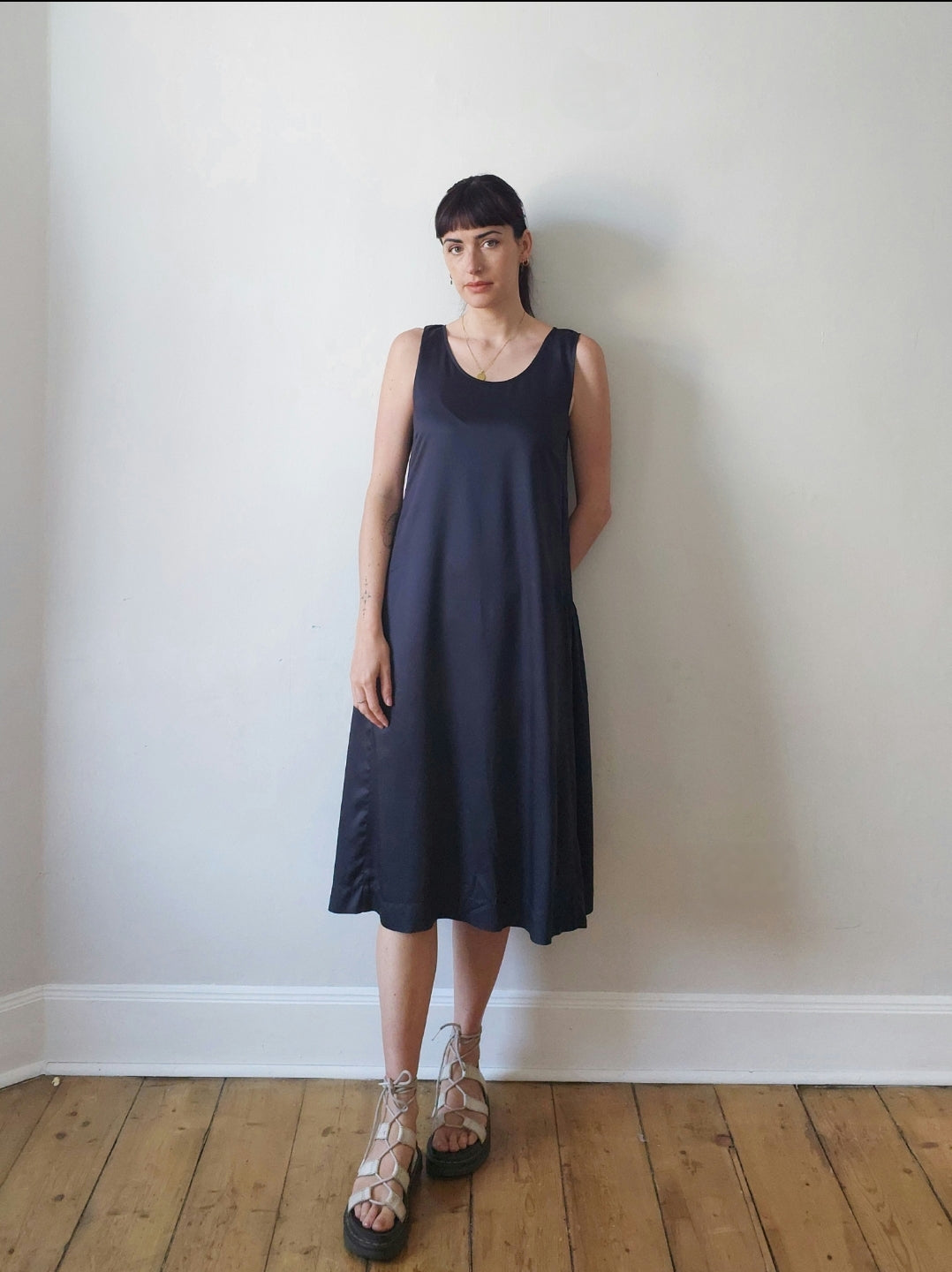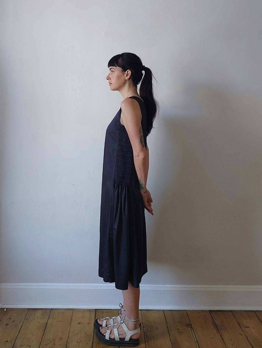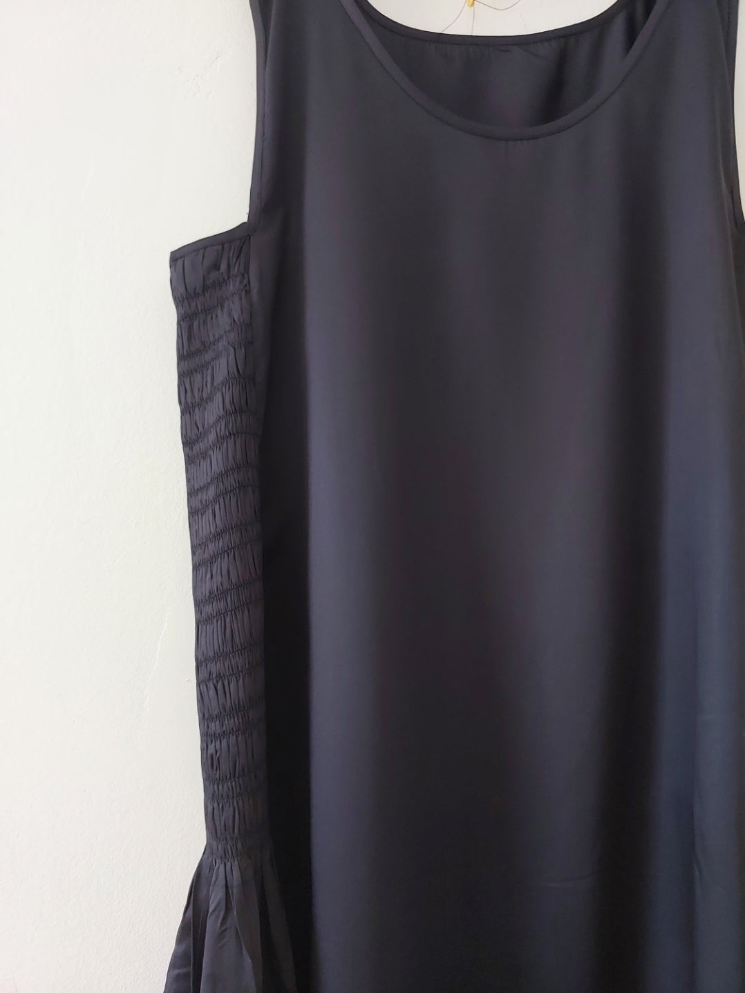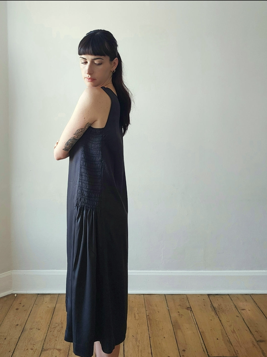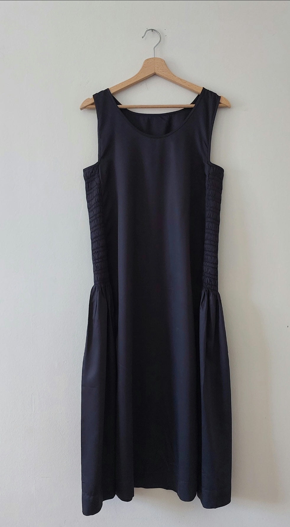 A silky bamboo viscose makes this dress drape beautifully. A-line dress featuring two shirred side panels. An elegant yet comfortable dress. Perfect for summer or layering in winter.