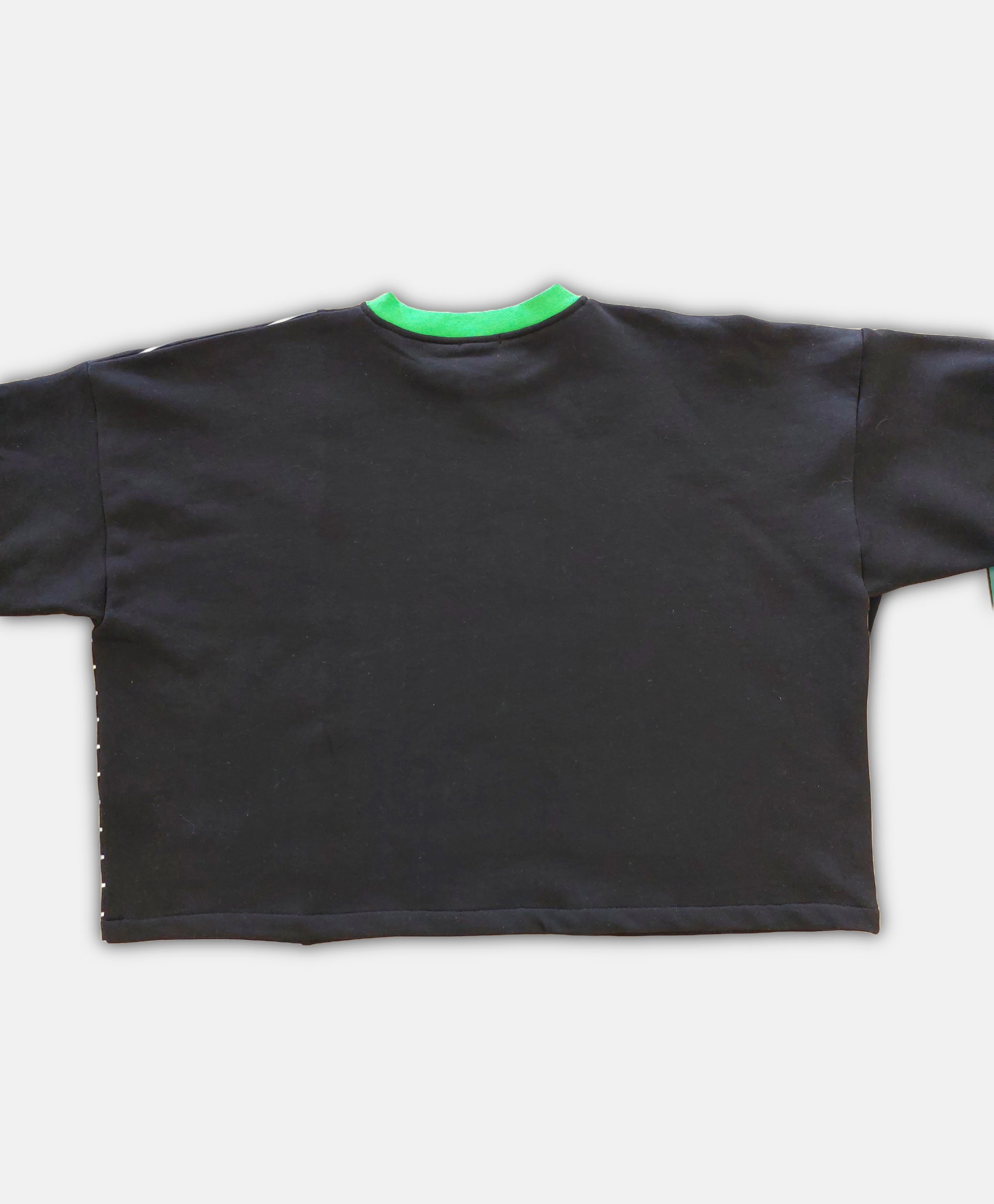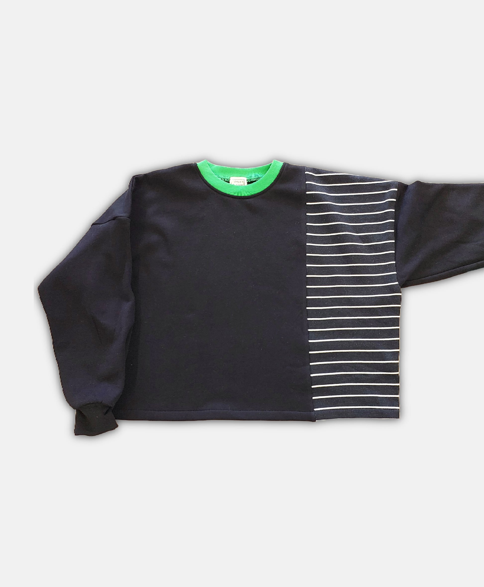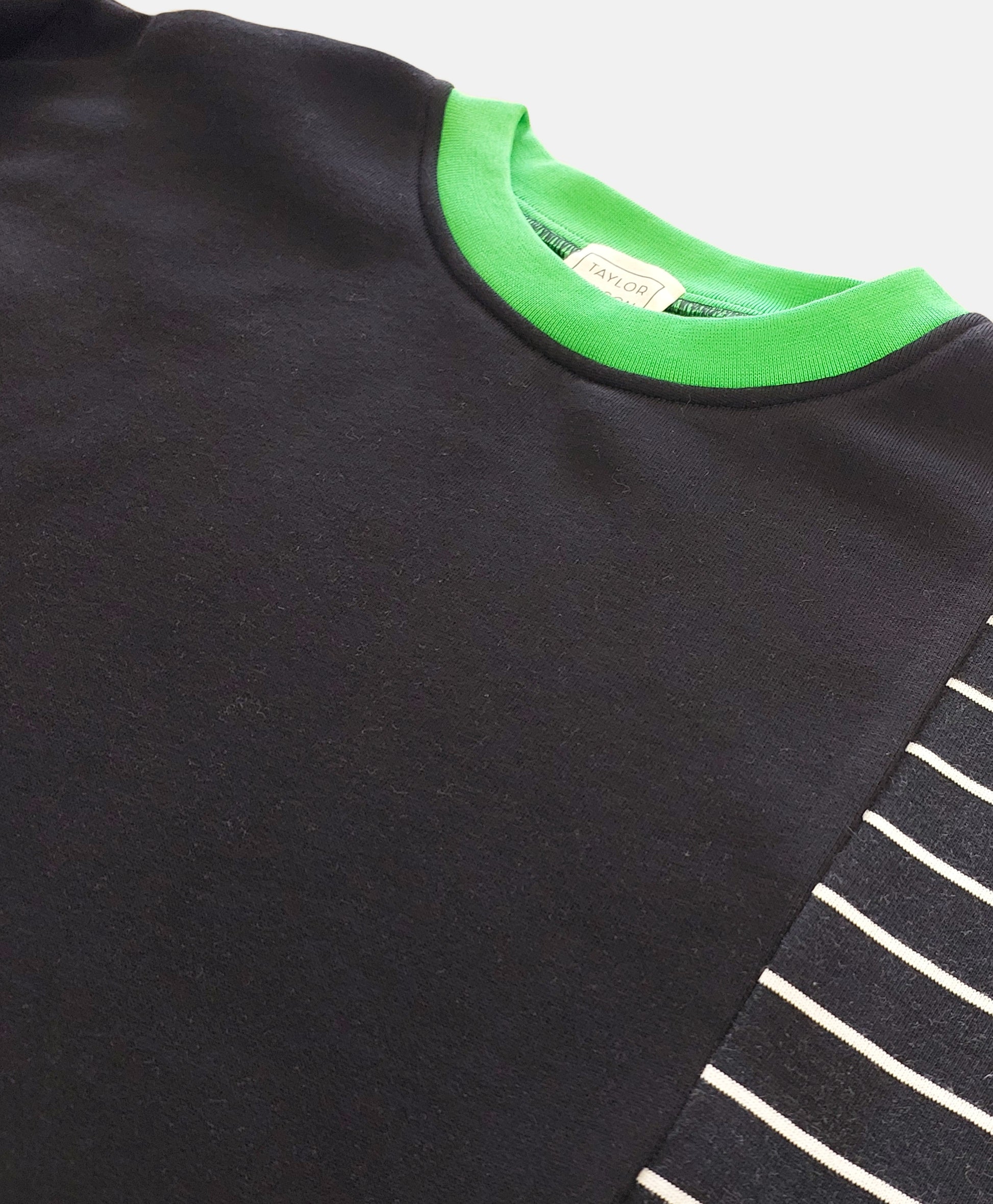 Made from soft brushed back organic cotton fleece. Paneled design with black, stripes and contrasting green neckline. Boxy, oversized fit.